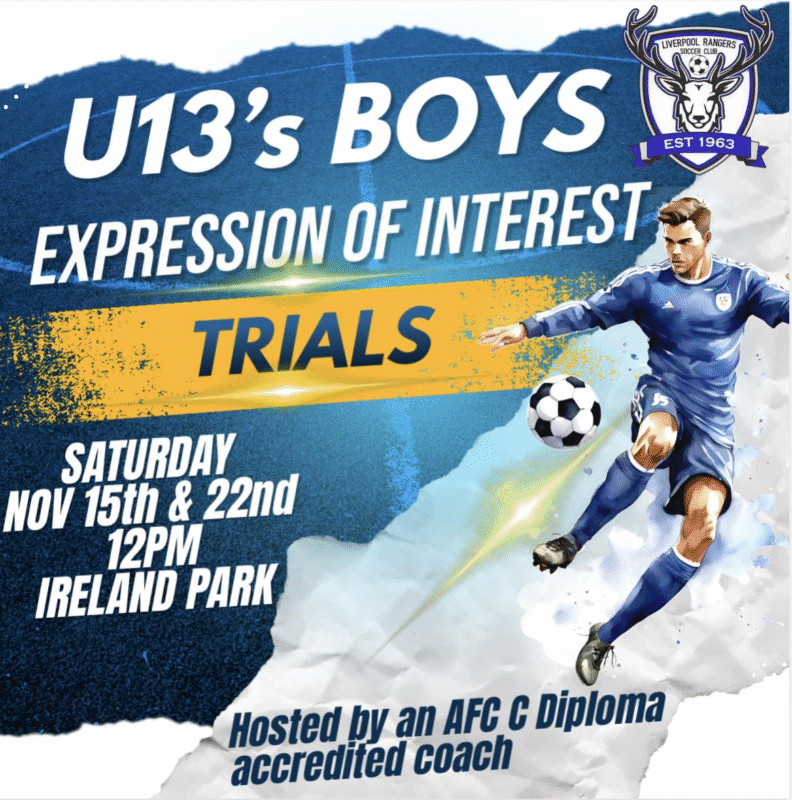 Liverpool Rangers will be holding back to back trials for U13’s boys with an AFC C Diploma Accredited Coach.